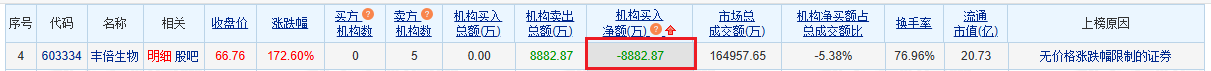 中国经济网北京11月5日讯:丰贝生物科技(603334.Sh)今日在上交所主板挂牌上市。该股开盘66.00元,收盘报66.76元,涨幅172.60%。成交额16.5亿元,幅度40.83%,换手率76.96%,总市值95.80亿元。龙虎榜数据显示,峰壁生物销售额前五名的公司中,全部都是机构独享席位。据统计,丰贝生物今日卖出的机构席位净值为8882.87万元。