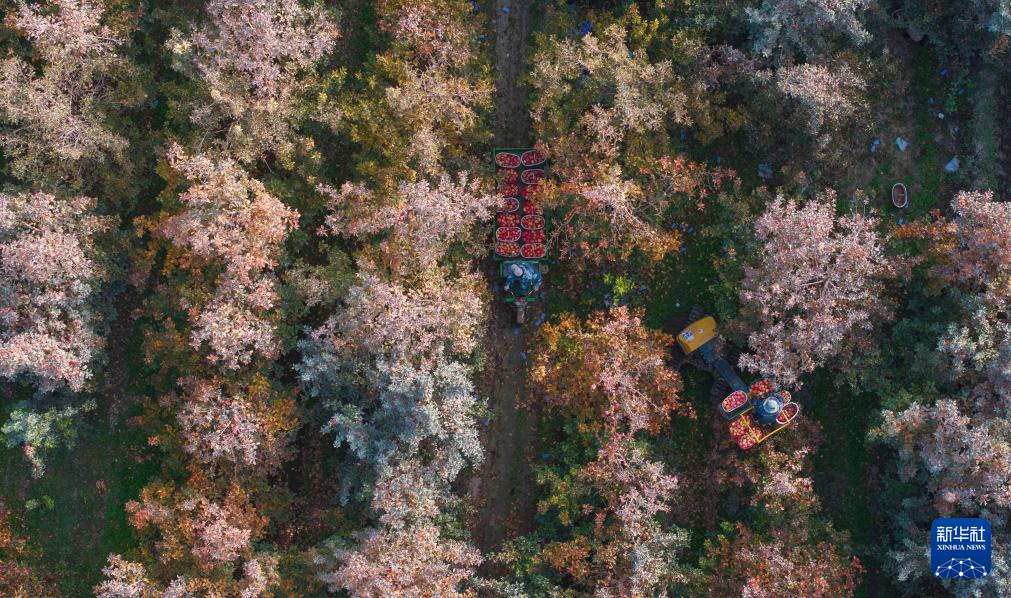 中国经济网版权所有 中国经济网新媒体矩阵 网络广播视听节目许可证(0107190)(京ICP040090) 10月23日,林果产业服务队队员带着刚采摘的苹果来到新疆生产建设兵团第一师阿拉尔市六团三连苹果园(无人机照片)。阿拉尔市是新疆生产建设兵团第一师,地处天山南麓、塔克拉玛干沙漠北缘。日照时间长,昼夜温差大。这里种植的苹果皮薄、肉厚、味甜、汁多、含糖量高,是当地的特产名片。新华社记者 蔡阳 摄 (编辑:单小兵)